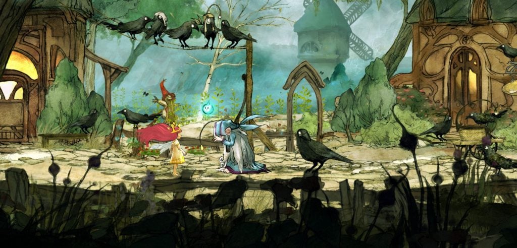 Child of Light was developed using the UbiArt framework development platform, the same engine that powers Rayman Origins and Rayman Legends. That series’s pedigree can be seen in this game’s background art, effects, even a couple of minor gameplay touches, such as the power-up collection, which isn’t different than collecting Lums, and Aurora’s ability to fly, an exhilarating repurpose of the mechanics used for Rayman’s underwater levels. But the actual aesthetic has grander, more awe-inspiring ambitions. Fairly simple, archetypical fantasy designs are married with a gentle, dream-world fluidity of motion, and a quirkiness that’s pretty much all its own, all bolstered with the power of the PS4, running it at 60fps. The end result is a painterly world somewhere between Yoshitaka Amano’s old-school Final Fantasy art and a more fantastical Studio Ghibli film. It’s a place that invites player to slow down, explore, see more of the vast, detailed tableau UbiSoft Montreal has created here, instead of running circles in it to level grind.
